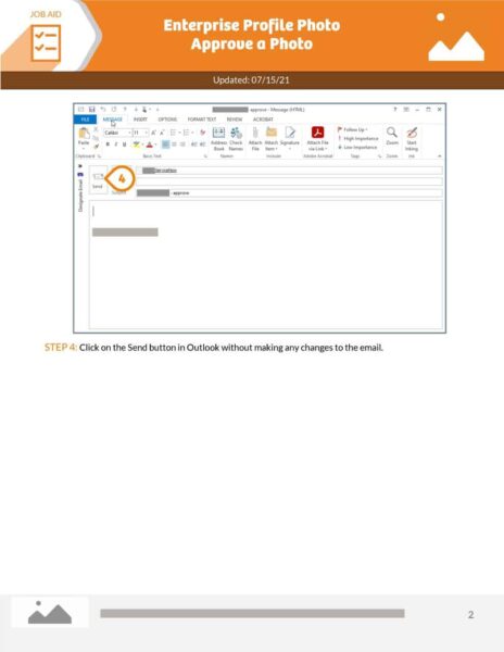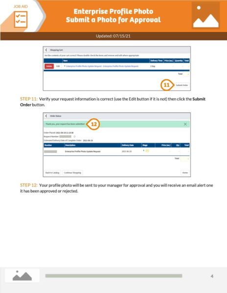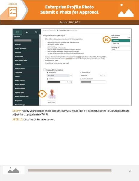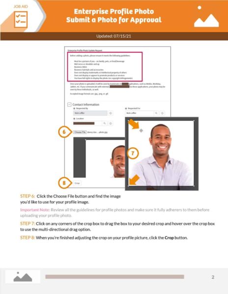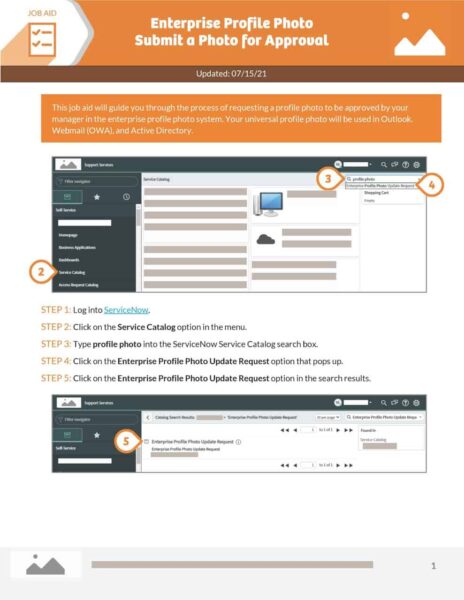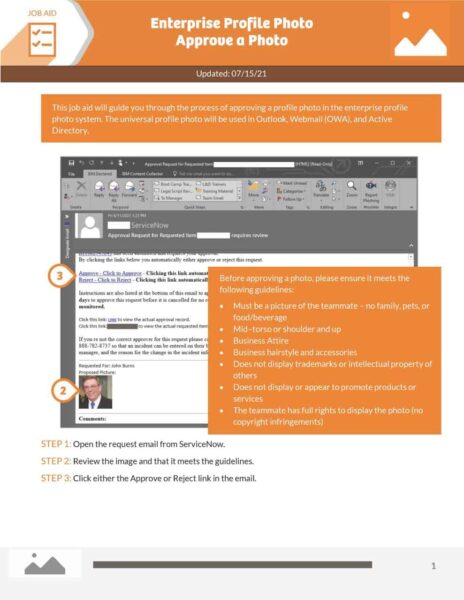 So, since this is mainly a change management issue with little need for knowing anything, job aids were the perfect solution. That way the job aids can be offered as a quick aid for employees to submit a photo request and understand the requirements too.